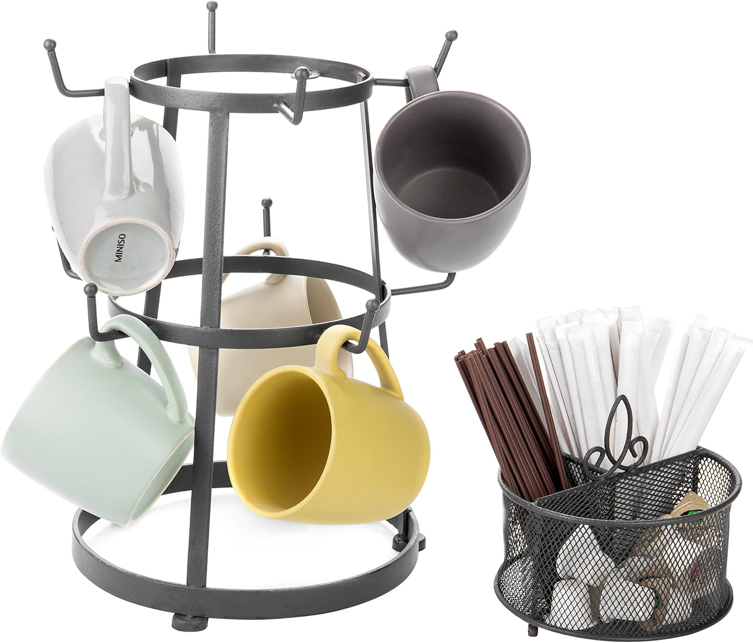 Amazon Com Mygift 9 Hook Grey Metal Coffee Mug Cup Stand With Utensil Bin W Removable Accessory Basket